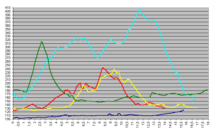 1. Etappe 49m | 2. Etappe 195m | 3. Etappe 173m | 4. Etappe 357m | 5. Etappe 209m